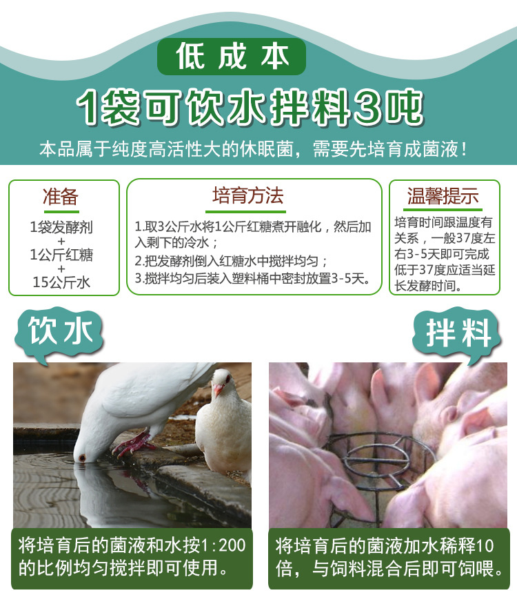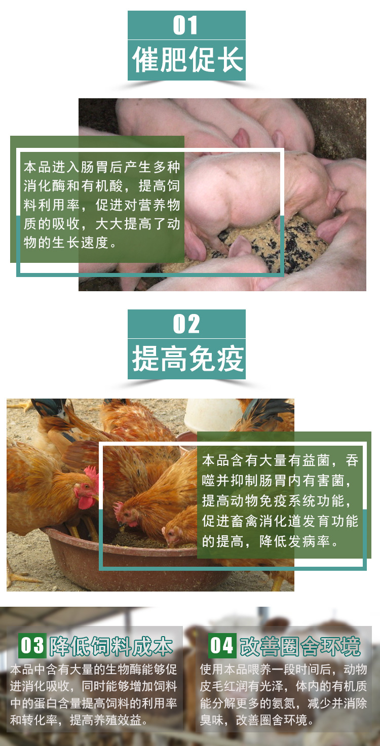 1.催肥促长 增强动物消化系统功能,促进饲料的吸收和转化,降低料肉比,缩短养殖周期. 2.提高免疫 清理肠道有害细菌,维持肠道益生菌群平衡,增强动物体质,预防疾病发生,防止腹泻拉稀,提高免试能力! 3.改善圈舍环境 长期使用本品,能够降低动物粪便臭味,抑制圈舍细菌滋生,改善养殖圈舍环境。 4.降低成本 缩短养殖周期,提前出栏,节省饲料,提高免疫能力,预防病害,降低用药成本。 ![]() |