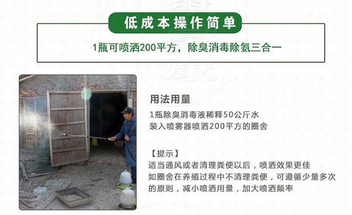 1、稀释喷洒:农富康生物除臭液一瓶可稀释到50公斤的水中、直接喷洒空气、地面、墙壁、舍顶、排水沟,达到除氨气和消毒防病的作用;一般情况下,一瓶可喷洒300平方。首次可连续喷洒3天,之后根据圈舍环境情况7-10天喷洒一次,量大勤用效果愈加显著。