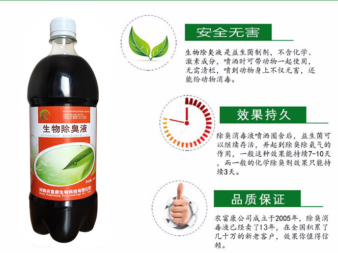 1、农富康生物除臭液为纯生物制剂,安全无毒,对动物没有任何副作用。