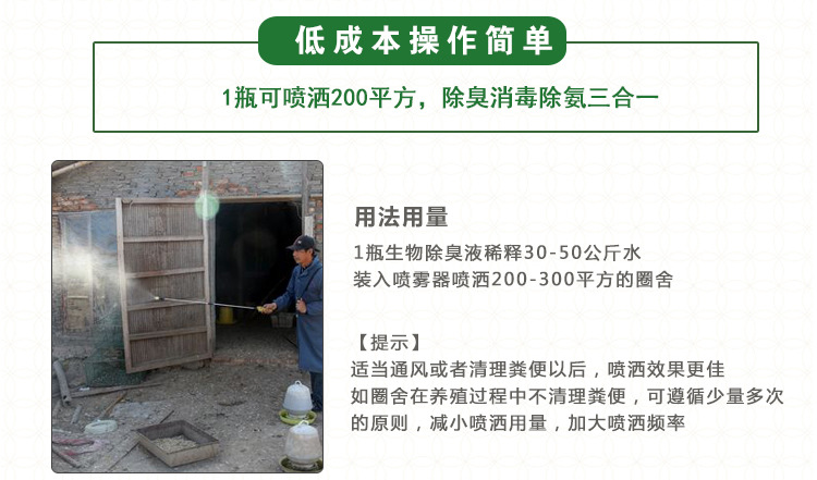1、瓶生物除臭液兑水30-5公斤,喷200-300平米养鸭场,然后用喷洒,把地面、空气、墙壁、喷一遍,鸭身上也可以喷喷, 选在晴天中午温度高时喷效果更佳,菌活***受温度影响,温度高活***强,除臭快,如果有窗户的养鸭场,喷完后1小时再开窗通风。