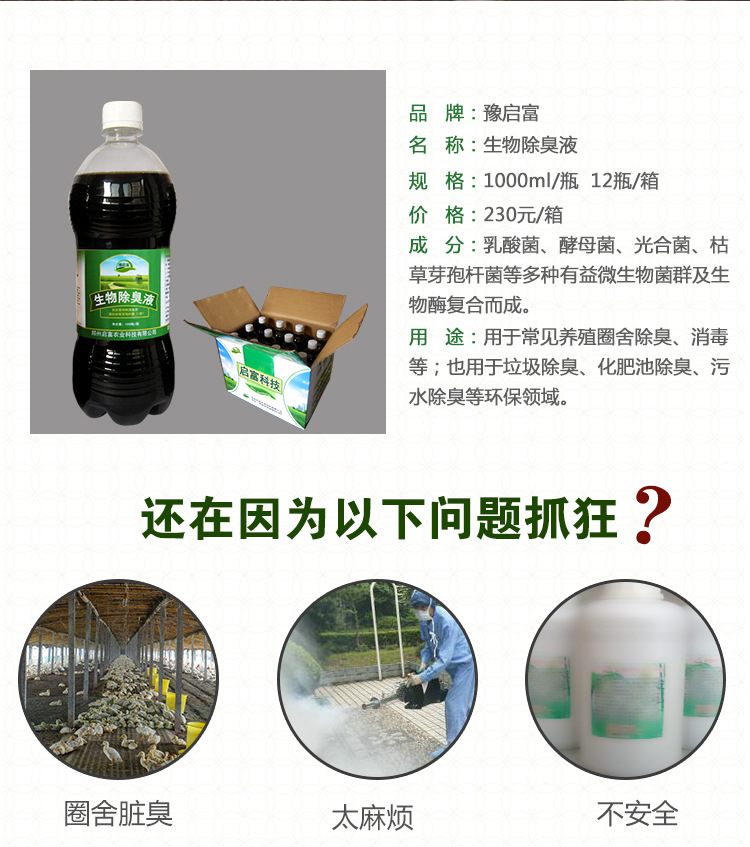 生态启未来!科技富四方!郑州启富农业科技有限公司专注生物除臭研发生产十年!现面向全国各地级 市、县、区广招代理商!丰厚的利润空间!严格的区域保护政策!欢迎来电咨询!咨询电话:17803835685(李经理)扫描上方二维码可获赠启富产品技术资料一份!订购提供全程技术跟踪服务!