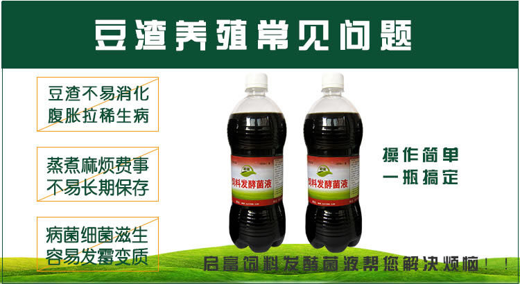 处理豆渣的土方法是蒸煮豆渣,通过高温把营养变成小分子的,容易吸收,但是蒸煮耗费人工和燃料,大批量处理豆渣不适用,这种方法早已被淘汰。现在提倡科学喂养,经过豫启富饲料发酵菌液(以发酵豆渣喂猪为主)发酵豆渣以后再饲喂,生豆渣在发酵过程中分泌与合成的大量活菌、蛋白质、氨基酸、各种生化酶、促生长因子等营养与激素类物质,能调整和提高动物机体各器官功能,提高饲料转化率,对动物产生免疫、营养、生长刺激等多种作用,达到防病治病、提高成活率、促进生长和繁殖、降低成本、消除粪尿臭味、净化环境、增产增收等效果。
