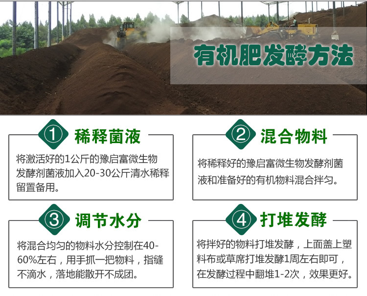 3、水分控制:根据自己的调节进行翻扒使其物料均匀(翻堆机 人工翻扒),将发酵物料的水分应控制在45~50%。水分判断:手抓一把物料,紧握成团感觉潮潮的,落地即散为宜。水少发酵慢,水多通气差,还会导致“腐-败菌”工作而产生臭味;粪便发酵剂 粪便发孝剂 发酵粪便做肥料 快速腐熟 不烧根烧苗 提高养分