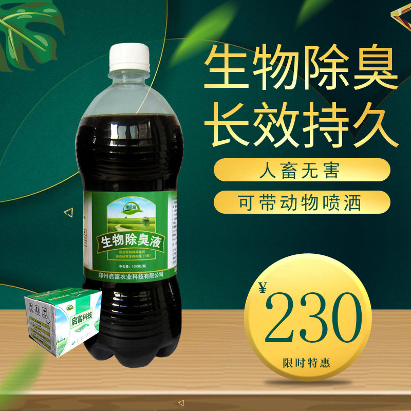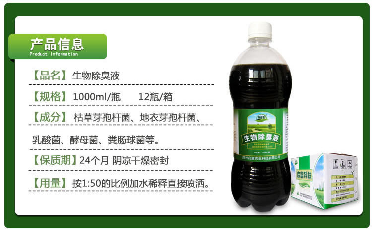 豫启富生物除臭液(养殖场除臭剂)是有枯草芽孢杆菌、地衣芽孢杆菌、酵母菌、粪肠球菌等多种有益微生物菌