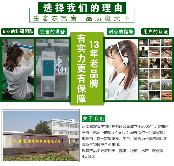 农富康公司成立于2005年,是业内从事微生物菌发酵技术研发与生产的企业之一,公司产品主要用于养殖、种植、水产、环保等四大领域,产品十多种,畅销10余载,深受广大用户喜爱!购买欣圣源产品,公司免费指导技术操作、赠送资料,全程跟踪指导!