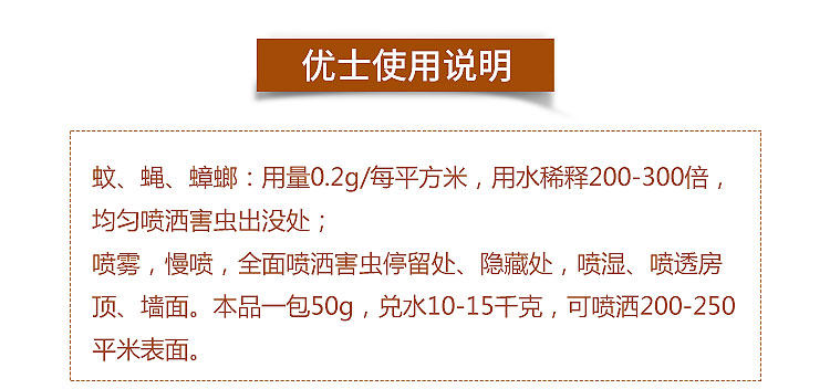 1,药物防治,这也是控制蚊蝇的重要措施,迅速降低蚊蝇在畜禽内外的密度,优士能有效的杀灭成年蚊蝇,在5-10秒钟内击毙蚊蝇,药效长达30天。先对四周环境用清水喷洒,再用优士稀释20-300倍,喷洒一遍,等周围环境干燥后,再喷洒一遍,长效达30天,无毒副作用,对猪只无影响。