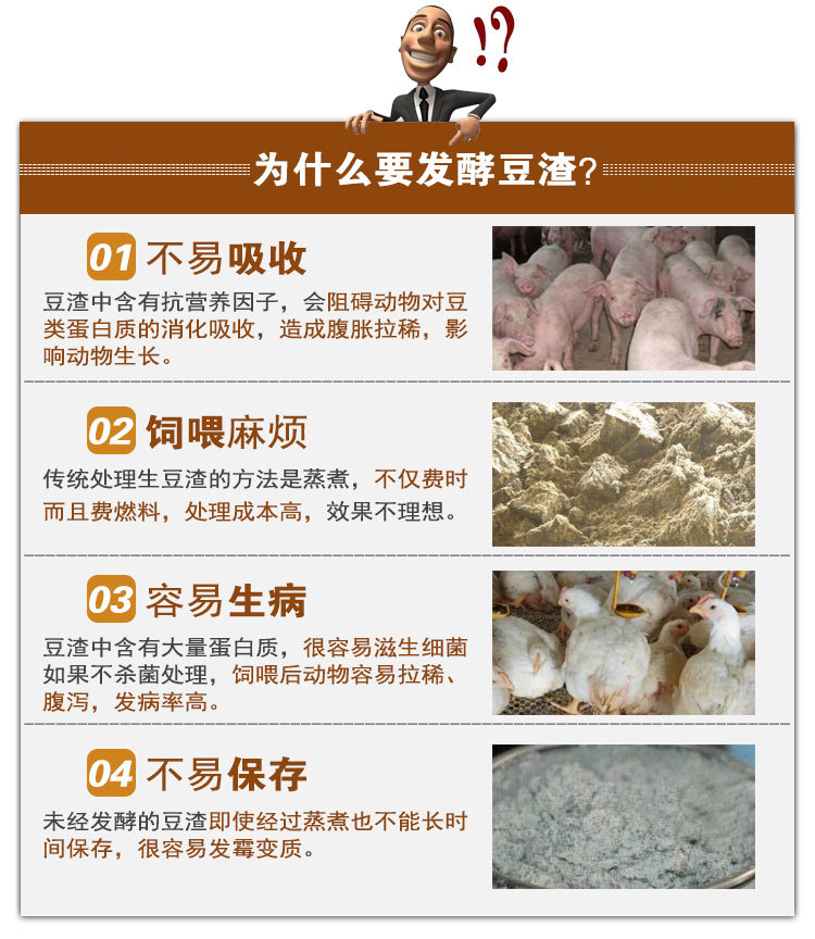 市场上的豆渣发酵剂有好多种,不知道怎么选择发酵剂来发酵豆渣(豆腐渣)。说白了就是看花眼了,各说各的好,简单的方法就是你问下你们有生产许可证没有。假如连生产许可证都没有的厂家,我想你也不敢用的,毕竟咱们养猪 也不容易,要买就要买放心厂家的发酵剂。