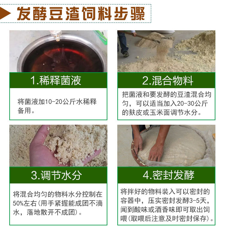 把发酵剂和豆渣(豆腐渣0、玉米面或麦麸混合均匀,可一边搅拌一边泼洒发酵剂,含水量在50%(用手紧握能成团不滴水,落地能散开不成团),放入能密封的容器(水泥池、土窖、缸、塑料袋等)中发酵5-7天具有醇香味就可以拿来喂猪了。