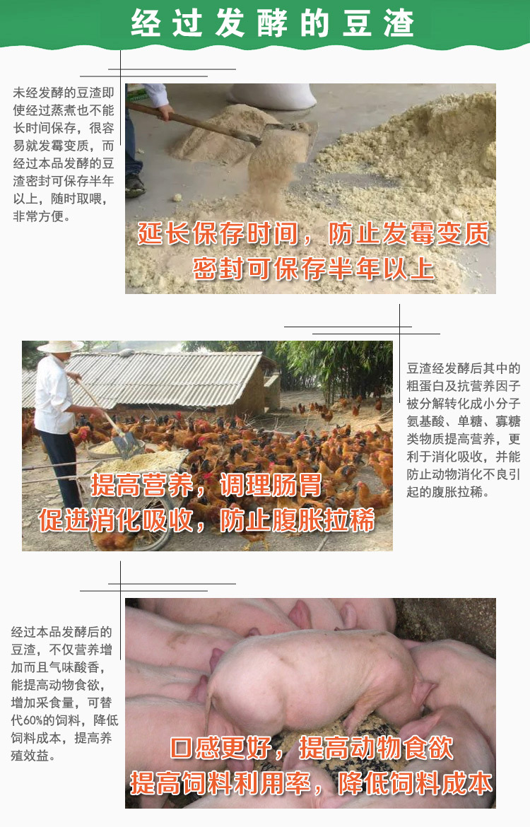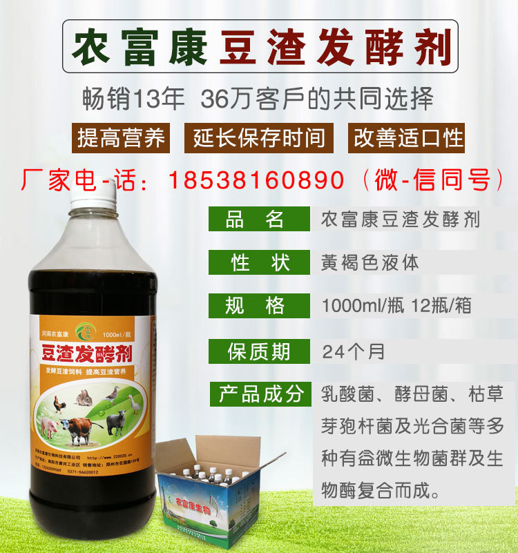 农富康豆渣发酵剂,是河南农富康生物科技有限公司投入生产使用十三年来,已有36万用户!农富康豆渣发酵剂是高活性有益菌组成的,这些益生菌活性强、繁殖率高,发酵豆渣时间短,发酵方法简单。这些益生菌会随着豆渣(豆腐渣)进入猪的肠道,在猪肠道内繁殖,抑制肠道中有害杂菌的滋生,增强肠道消化功能,逐渐增强猪的免疫力,猪不容易生病,生长速度快,还能达到提前出栏的效果。产品质量过硬,技术服务完善,货源充足的。