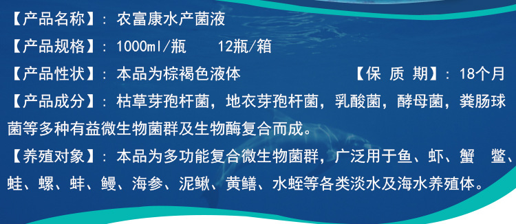 农富康水产菌液是多功能微生物制剂高效复合益生菌,对水产鱼类没有任何的伤害,可以直接使用,水产菌液一箱12瓶,1瓶1公斤,在鱼塘水深1米的情况下,一次1瓶足易。农富康厂家直销 量大价优 全国订购热线:136-8382-3726 (微信-同号)