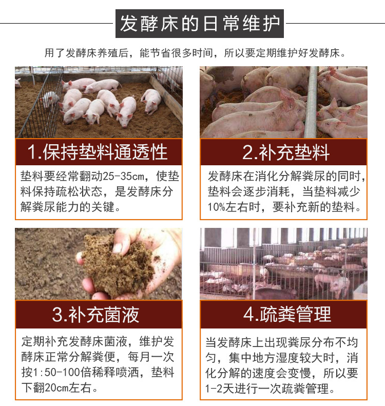 养猪使用发酵床的人越来是越多,养猪使用发酵床既简单又方便,长期使用养猪发酵床即可以省去很多的猪饲料,又可以提高猪的免疫力,使用简单,操作方便,养猪发酵床主要选对发酵床菌种可以省去很多的麻烦事,即可以节省饲料成本,又可以提高养猪的养殖效益,好的发酵床菌种活性强,效果好,分解粪便的速度快,圈舍无臭味,是微生态养猪的好帮手!