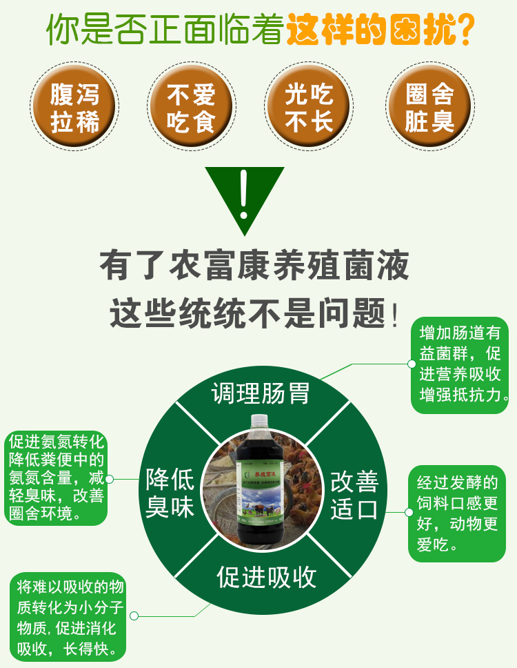 公司生产的 农富康养殖菌液,农富康种植菌液,农富康水产菌液,农富康发酵床菌液,系列产品。“创新为本、以质取胜、专业服务、实现共赢 ”是公司的经营理念。农富康公司正积极适应新形势,加快调整步伐,迈入机制合理、决策高效、技术领先、经营灵活的优秀企业行列,实现可持续性发展;以“多做一点、做好一点”的行为准则,追求好的公司治理,对社会发展做出贡献;庄重承诺“服务农业、缔造绿色”的企业宗旨,与客户共享成功,与社会共同进步。