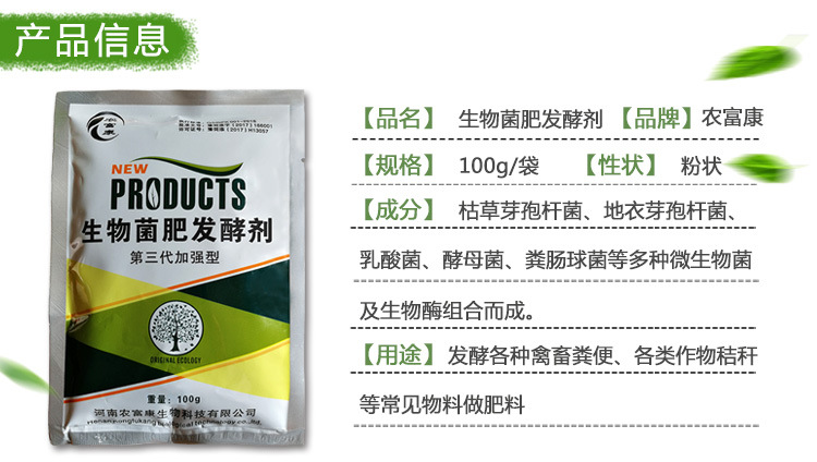 3.农富康生物菌肥发酵剂是微生物制剂,主要是有枯草芽孢杆菌,地衣芽孢杆菌,粪肠球菌,光合作用菌,酵母菌,乳酸菌等多种菌群配置而成,通过菌群之间的协同作用分解并控制粪便中的有害菌的生长,从而可以更好的分解粪便中的有害菌,从而缩短粪便的腐熟时间,臭味小,改良土壤,使用的成本低,肥效好。