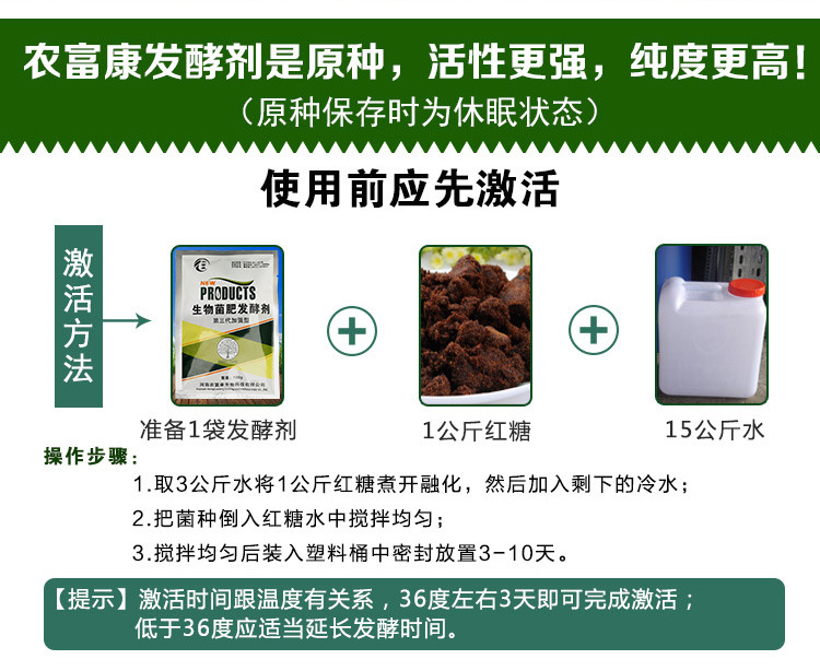 农富康生物菌肥发酵剂由多种有益菌群迅速作用提高发酵效果,缩短发酵时间,一般在7-12天就可以腐熟彻底了。