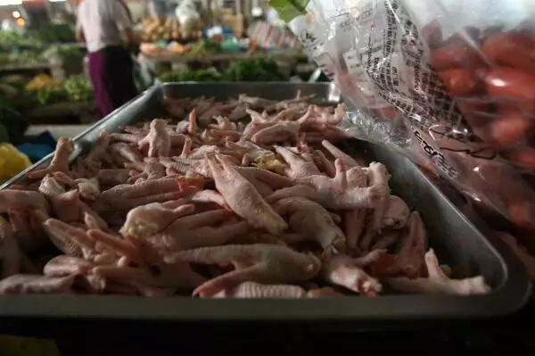 云南景洪市场上销售的冷冻鸡爪,没有任何包装,很难鉴别来历。 CFP 资料