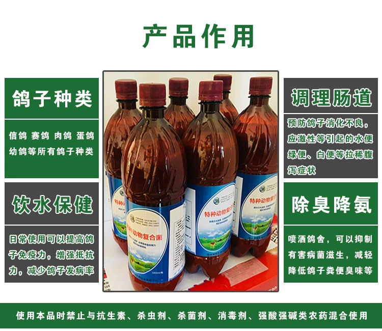 1.饮水拌料:用200公斤的水稀释一瓶养殖菌液,给鸽子直接饮用,也可拌入饲料喂养。病弱的鸽子可以直接按照鸽子体重每公斤1-2ml的菌液直接喂服。 |