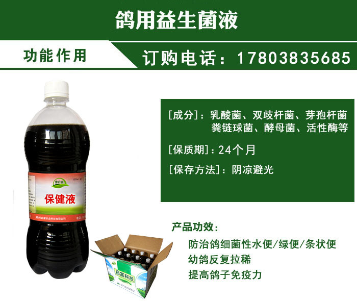 豫启富保健液益生菌(鸽用益生菌)是由多种有益菌经过特殊工艺加工而成的微生物菌群,主要成分有:乳酸菌、酵母菌、光合细菌、芽孢杆菌、放线菌等等,对鸽子没有任何副作用,长期饮用,可以迅速在肠道建立菌群平衡,改善肠道,同时也能够吞噬肠道内病菌杂菌,从根源解决水便绿便等拉稀问题!促进鸽子的生长速度,降低鸽子粪和鸽子舍中氨气等刺激***气味。产品订购咨询热线:178-0383-5685