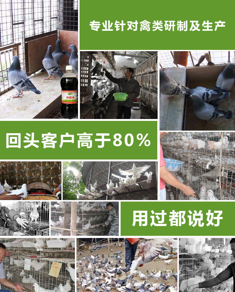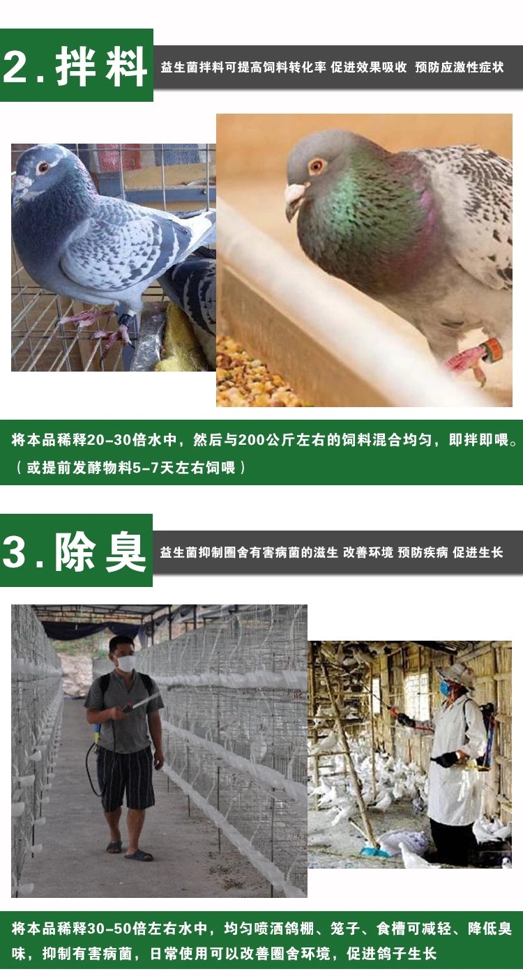 4、也可在日粮中拌入稀释后的5-10%保健液益生菌(鸽用益生菌),刚喂时掺入5%,适应后增加至10%或多些。