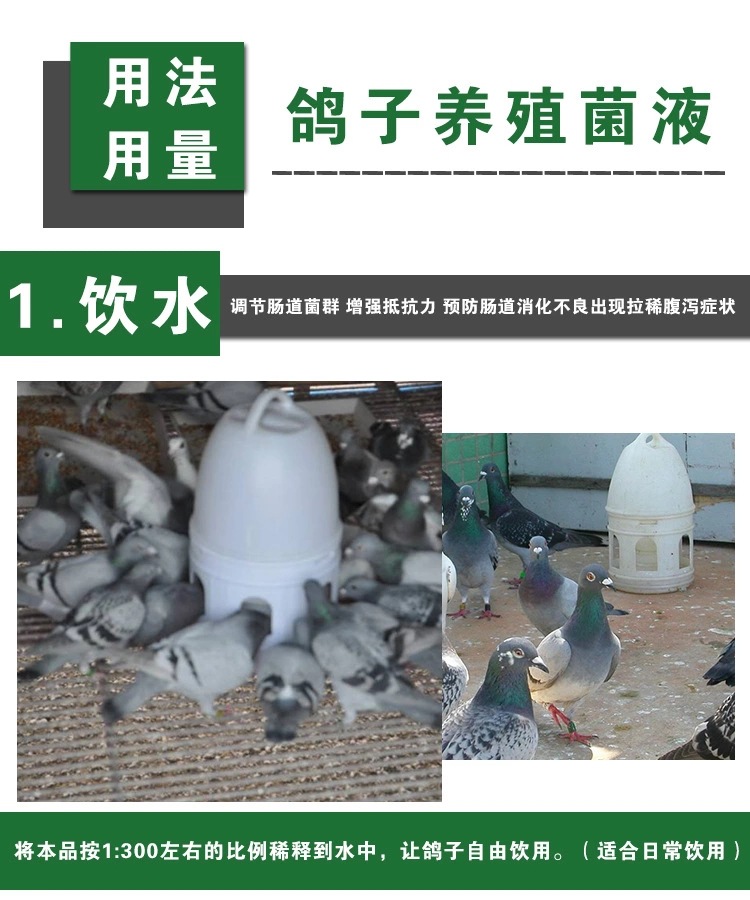 2、日常饮水:将豫启富保健液益生菌(鸽用益生菌)稀释成200~500倍稀释液后让鸽子自由饮水,幼崽采用200倍的菌液稀释液让其饮用。可预拉稀及球虫病,提高成活率。