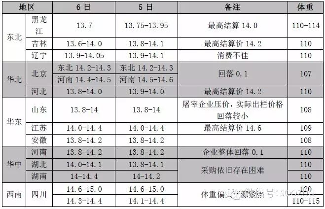 Soozhu观点:目前东北、北京、山东仍有小幅回落,终端需求疲软,预计明日东北仍有小降可能,北京、山东或持稳。河南企业明日或仍要压价。华南受降雨影响,虽交易市场烂市,但养殖户惜售仍在,预计明日稳中伴局部小涨。
